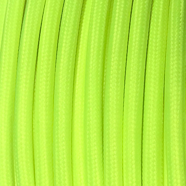 Cable eléctrico redondo con recubrimiento textil de llamativo color amarillo fluorescente. Cable decorativo ideal para diseñar tus propias lámparas o colgantes. Este producto cumple con las normas de seguridad europeas.