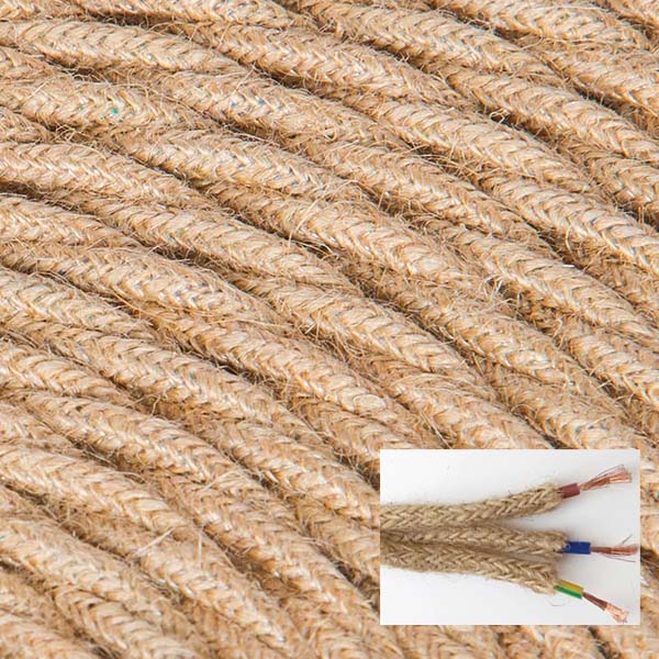 Cable eléctrico textil trenzado acabado cordón rústico. Replica del cable cordel de pita. Acabado tipo saco, con hebras deshilachadas. De gran grosor. Ideal en decoraciones vintage. Perfecto para colgantes rústicos a medida.