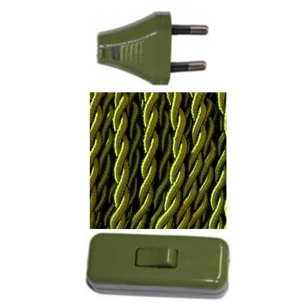 Decorativo cable eléctrico para conectar lámparas o aparatos eléctricos. Cordón textil trenzado de color verde (2 metros), clavija de conexión e interruptor pintados del mismo color.
