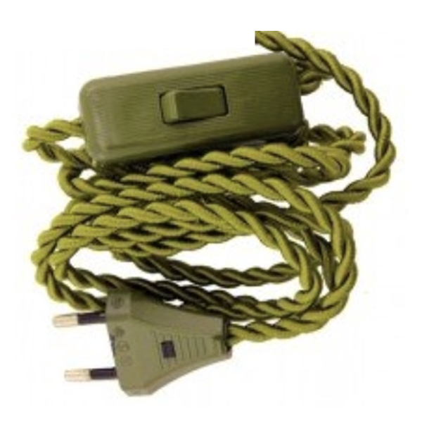 Decorativo cable eléctrico para conectar lámparas o aparatos eléctricos. Cordón textil trenzado de color verde (2 metros), clavija de conexión e interruptor pintados del mismo color.