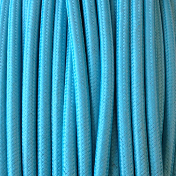 Cable eléctrico redondo con recubrimiento textil de color turquesa. El turquesa es un color envolvente, refrescante, relajante y tranquilizante. El turquesa es aconsejable, para el estrés mental, el cansancio y el sentimiento de limpiarse. Es un color brillante que está entre el verde y el azul. Cable decorativo deal para diseñar tus propias lámparas o colgantes.