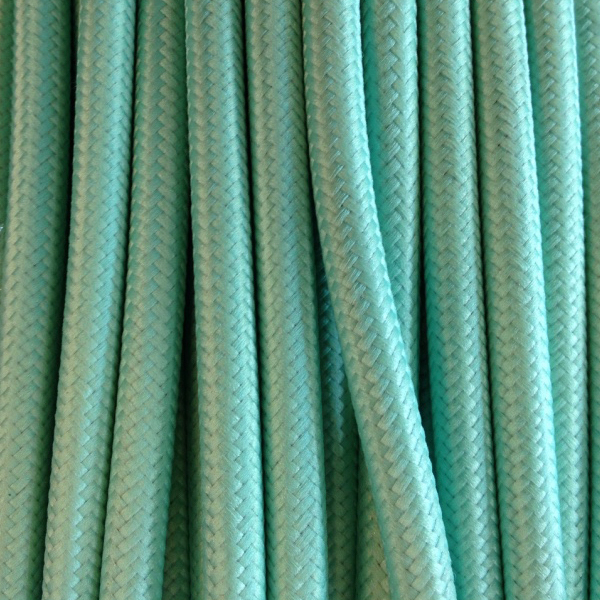 Cable eléctrico redondo con recubrimiento textil de color verde agua. El color verde agua o aguamarina es la mezcla entre el color verde y el color azul, obteniendo de esta manera un color claro casi transparente. Es un color que trae consigo varias características que lo destacan de todos los tipos de colores naturales que conocemos, entre esas encontramos Frescura, Calma, Serenidad y Juventud.