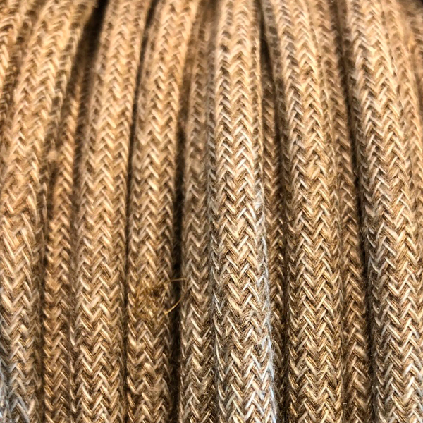 Cable eléctrico redondo con recubrimiento textil tejido de fibras de algodón color marrón corteza y lino natural. Su combinación de hilos de dos colores entretejidos forman un acabado mate que aporta calidez a este cable decorativo.
