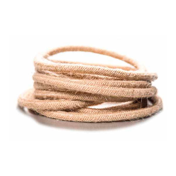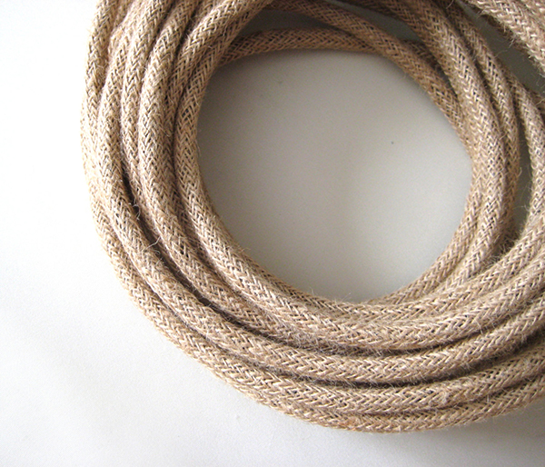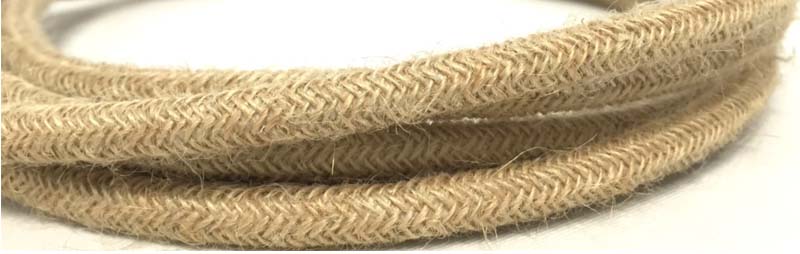 Cable eléctrico textil redondo acabado cordón rústico. Réplica del cable cordel de pita. Acabado tipo saco, con hebras deshilachadas. De 8 mm de diámetro. Ideal en decoraciones vintage. Perfecto para colgantes rústicos a medida.