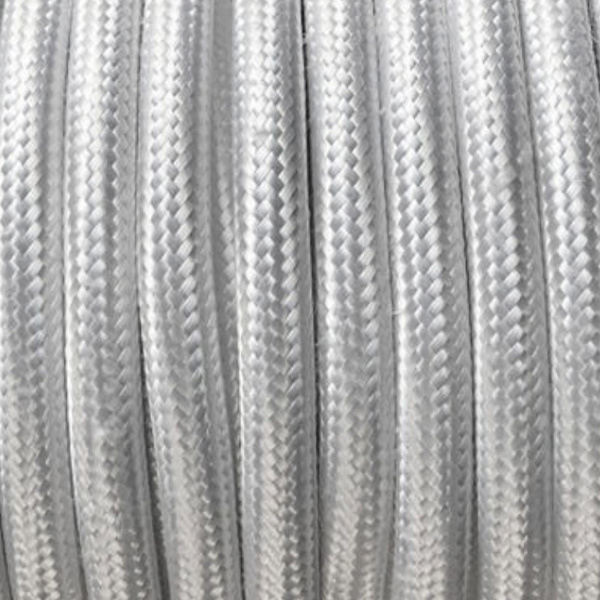 Cable eléctrico redondo con recubrimiento textil color blanco brillo.