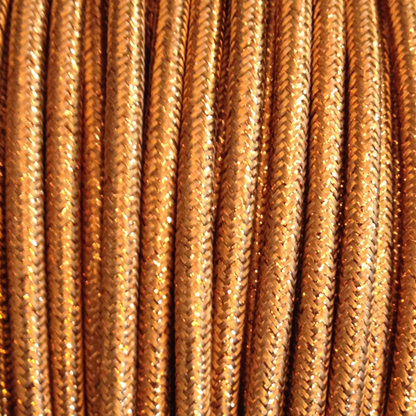 Cable eléctrico redondo recubierto en textil de color bronce con hebras de hilo dorado que le dan un efecto brillo. Perfecto complemento para tus lámparas. Cable decorativo para dar un toque original a nuestro hogar.