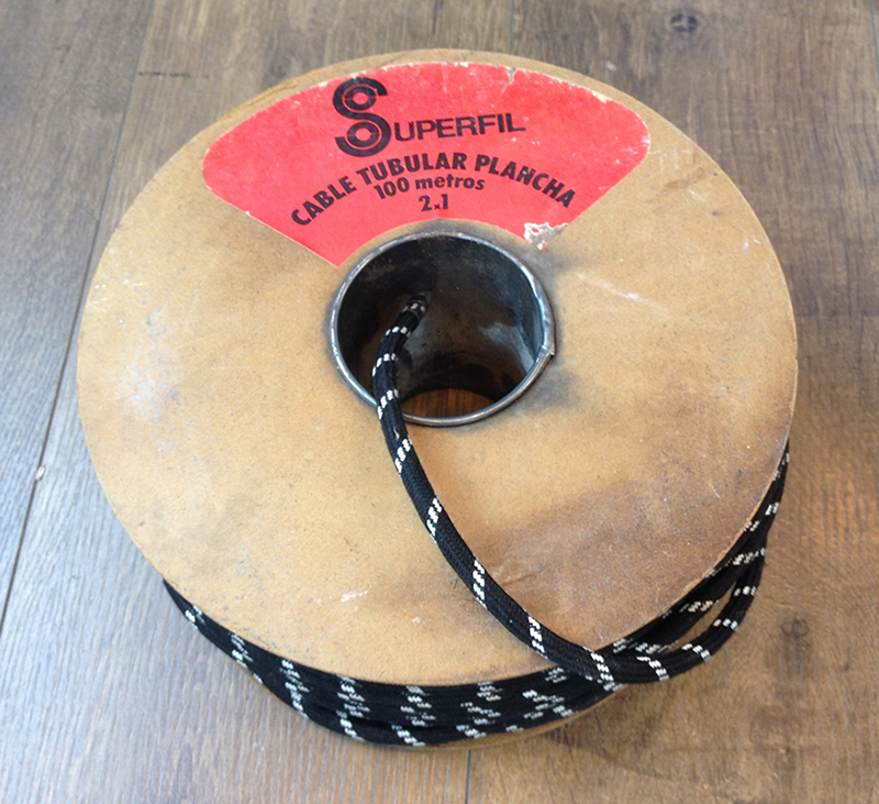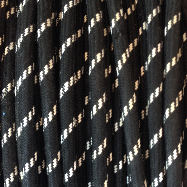 Cable eléctrico redondo recubierto en textil de color negro con líneas blancas. No se trata de una réplica, es el cable original, modelo “Superfil” fabricado por PIRELLI. ¡Últimos metros en stock! Cable idóneo para restaurar lámparas antiguas o crear nuevos diseños originales.