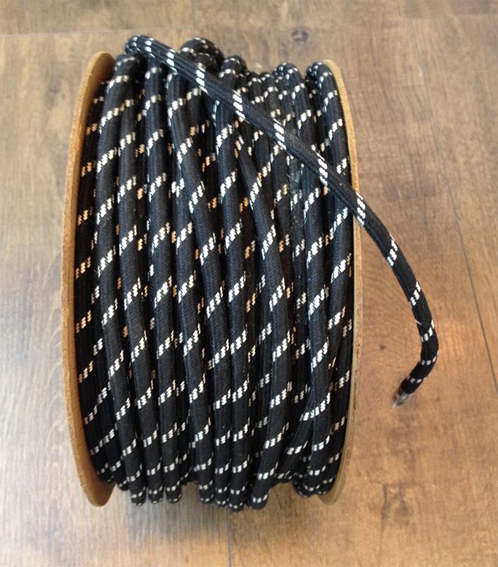 Cable eléctrico redondo recubierto en textil de color negro con líneas blancas. No se trata de una réplica, es el cable original, modelo “Superfil” fabricado por PIRELLI. ¡Últimos metros en stock! Cable idóneo para restaurar lámparas antiguas o crear nuevos diseños originales.