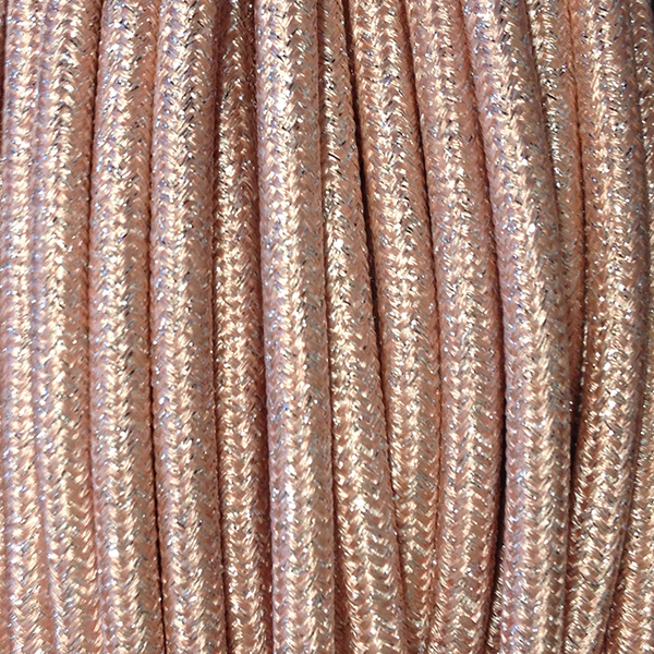 Cable eléctrico redondo recubierto en textil de color rosa claro con hebras de hilo plateado que le dan un efecto brillo. Perfecto complemento para tus lámparas. Cable decorativo para dar un toque original a nuestro hogar.