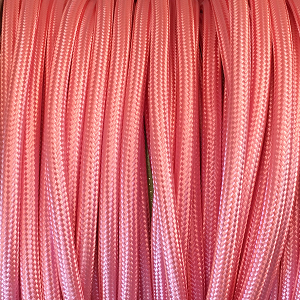Cable eléctrico redondo recubierto en textil de color rosa claro.