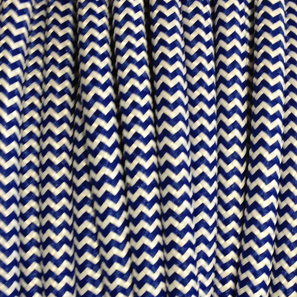Cable eléctrico redondo recubierto en textil de color blanco con líneas en ziga-zaga azules. Perfecto complemento para tus lámparas. Cable decorativo para dar un toque original a nuestro hogar.