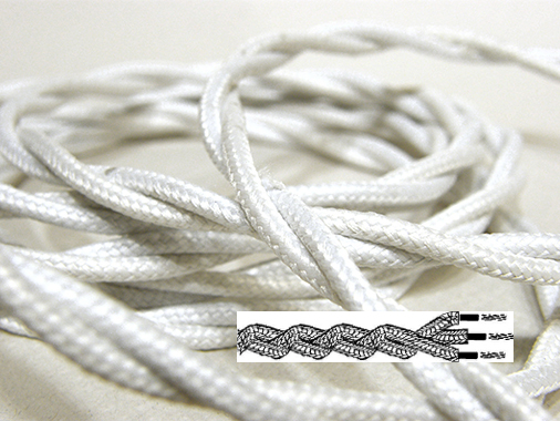Cable eléctrico textil trenzado en color BLANCO. Replica del cable antiguo. Elegante solución para instalaciones vistas con un toque vintage. Cable reforzado. Sección: 3x2,5 mm2. Conductores aislados en PVC. Este cable de 3 conductores (de 2,5mm) es el adecuado para instalaciones de interruptores conmutados o enchufes con toma de tierra.