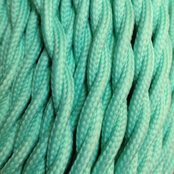 Cable decorativo trenzado, enfundado en textil de color verde agua. El color verde agua es la mezcla entre el color verde y el color azul, obteniendo de esta manera un color claro casi transparente. Es un tono muy fresco, alegre y juvenil . Ideal para crear lámparas originales, únicas, totalmente personalizadas.
