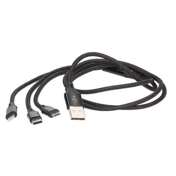 Cable USB con 1 conector USB y 3 conectores de tipo Micro USB, USB tipo “C” y iphone/iPad, de 1,2m de longitud. Sirve para carga cualquier dispositivo con uno de estos tres tipos de conectores.