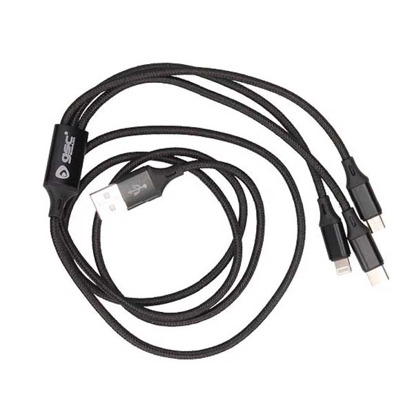 Cable USB con 1 conector USB y 3 conectores de tipo Micro USB, USB tipo “C” y iphone/iPad, de 1,2m de longitud. Sirve para carga cualquier dispositivo con uno de estos tres tipos de conectores.