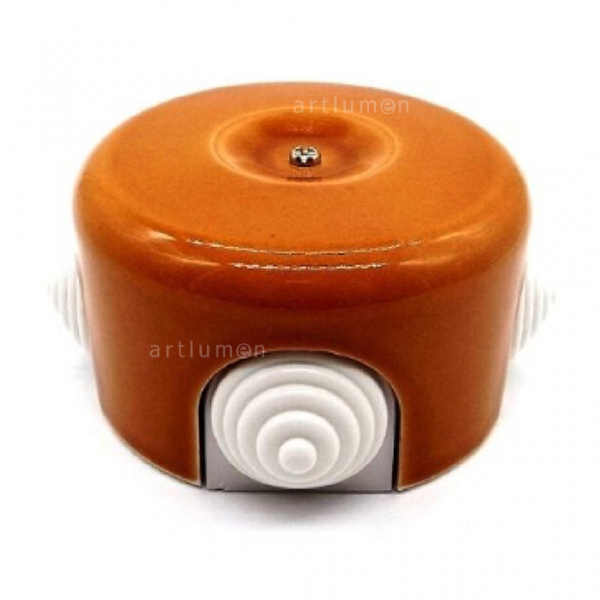 Caja de empalmes, para alojar las conexiones eléctricas. Fabricada en porcelana de color marrón claro. Complemento ideal para instalaciones de superficie con cables textiles decorativos.
