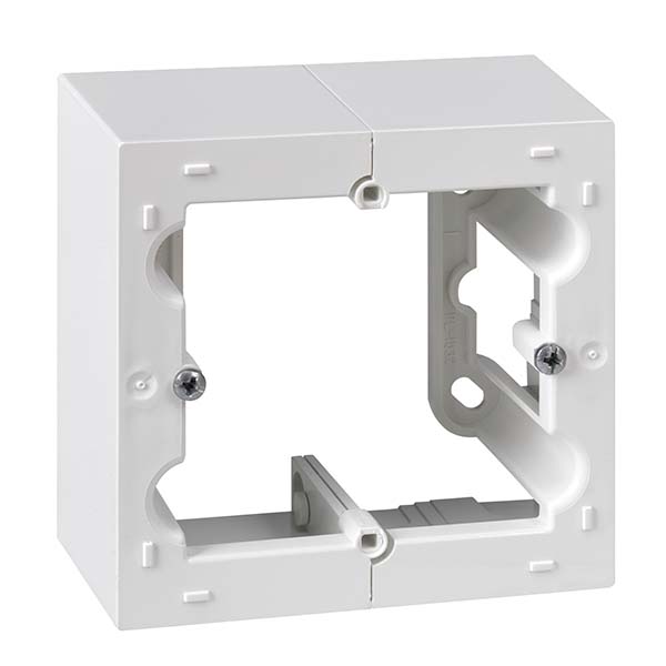 Caja para poder instalar en superficie, sin necesidad de empotrar en cajetín, sin obras, con solo atornillar, cualquier mecanismo de la serie Simon-10. Práctica solución en instalaciones donde no es posible empotrar mecanismos.