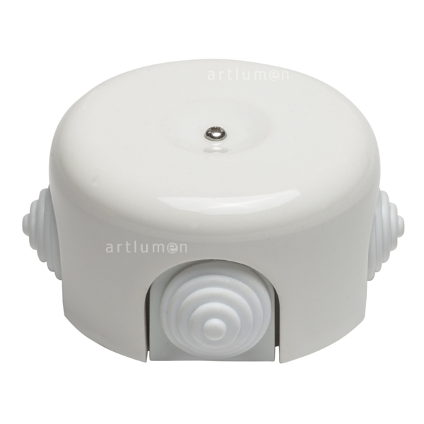 Caja para conexiones eléctricas fabricada en porcelana. Por su bonito diseño, muy adecuada para instalaciones vistas. Dimensiones: diámetro=90mm. altura=45mm.