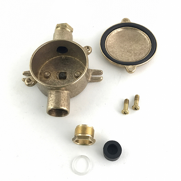 Espectacular caja de conexiones de aspecto industrial, fabricada en latón. Para instalación en superficie. Dispone de dos entradas para tubo y unos anclajes laterales para atornillarla.