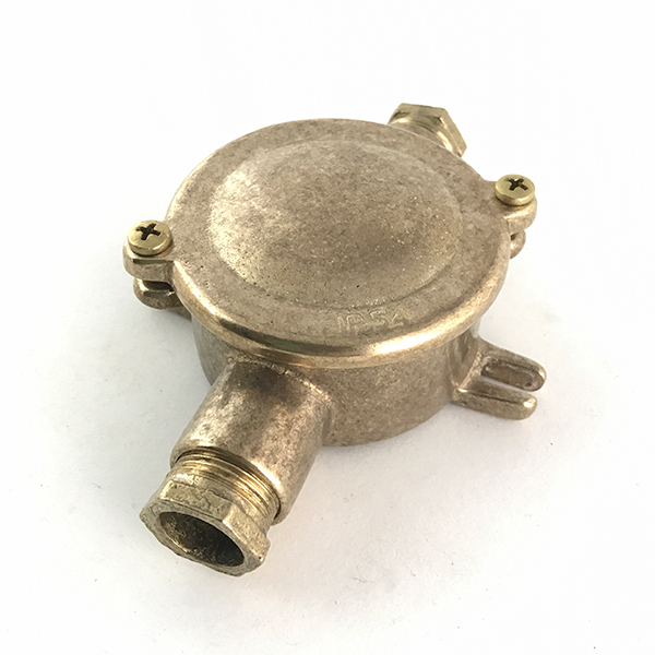 Espectacular caja de conexiones de aspecto industrial, fabricada en latón. Para instalación en superficie. Dispone de dos entradas para tubo y unos anclajes laterales para atornillarla.