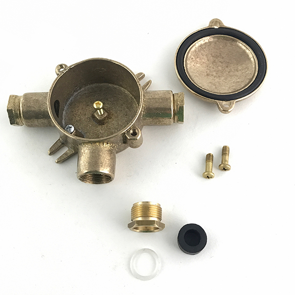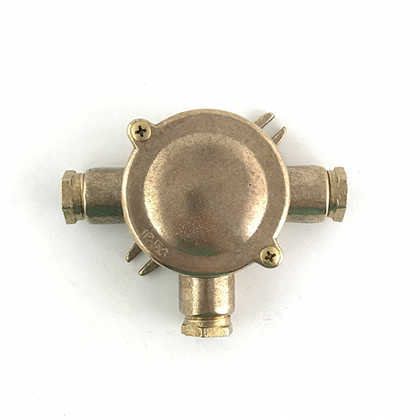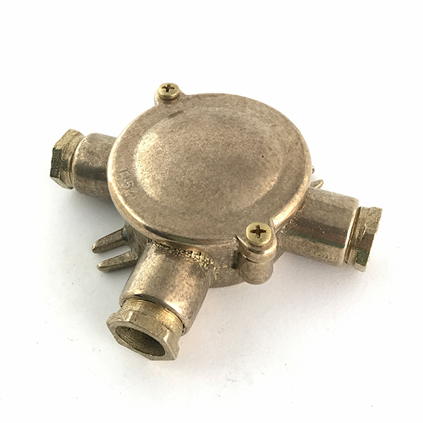 Espectacular caja de conexiones de aspecto industrial, fabricada en latón. Para instalación en superficie. Dispone de tres entradas para tubo y unos anclajes laterales para atornillarla.