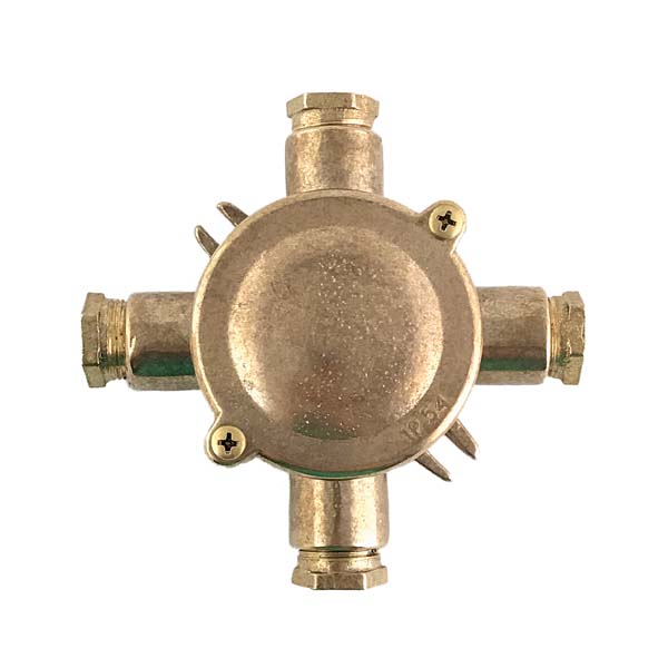 Espectacular caja de conexiones de aspecto industrial, fabricada en latón. Para instalación en superficie. Dispone de cuatro entradas para tubo y unos anclajes laterales para atornillarla.