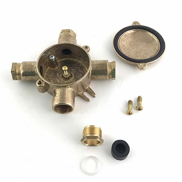 Espectacular caja de conexiones de aspecto industrial, fabricada en latón. Para instalación en superficie. Dispone de cuatro entradas para tubo y unos anclajes laterales para atornillarla.