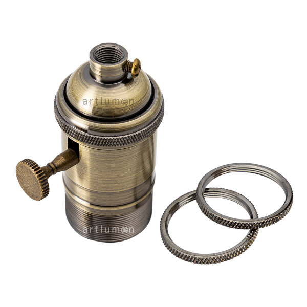 Portalámparas metálico, en acabado dorado envejecido. Incorpora un interruptor rotativo en su lateral. Cada cuarto de vuelta del interruptor enciende o apaga la bombilla. Muy adecuado para montar o restaurar lámparas de aspecto vintage. Para bombillas de rosca estándar E-27. Parte superior con paso de rosca 10/100. Embornamiento del cable por tornillo.