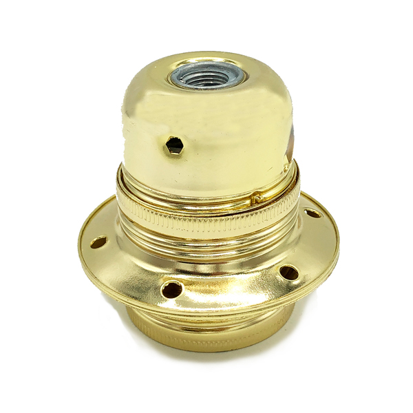 Portalámparas fabricado en metal de color dorado con cuerpo roscado y doble arandela. Estas arandelas permiten la sujeción de una pantalla o campana para componer una lámpara.