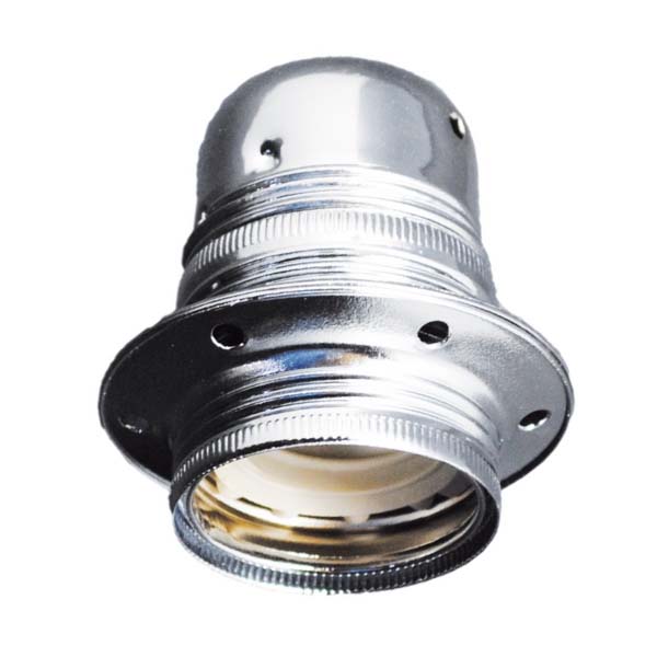 Portalámparas fabricado en metal de color plata con cuerpo roscado y doble arandela. Estas arandelas permiten la sujeción de una pantalla o campana para componer una lámpara.