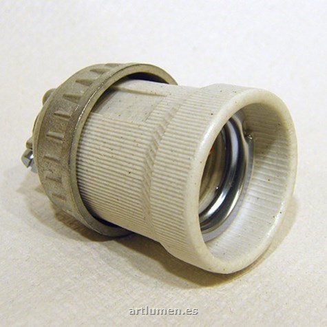 Portalámparas cerámico de estilo industrial. Rematado con una cúpula metálica de zamak plateado en su parte superior. El accesorio metálico tiene un paso de sujeción hembra de 10/100 y dispone de un tornillo de bloqueo. Para bombillas de rosca E27.