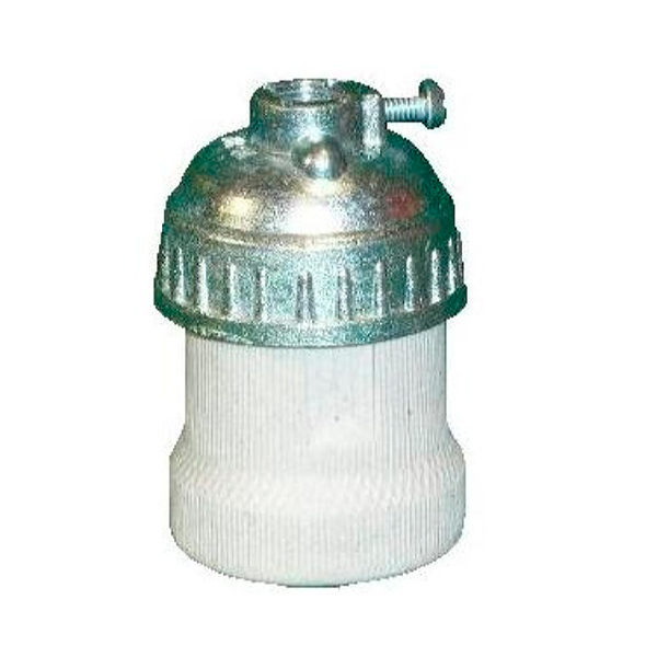 Portalámparas cerámico de estilo industrial. Rematado con una cúpula metálica de zamak plateado en su parte superior. El accesorio metálico tiene un paso de sujeción hembra de 10/100 y dispone de un tornillo de bloqueo. Para bombillas de rosca E27.