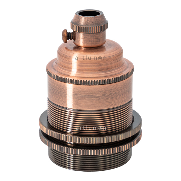 Portalámparas de gran calidad, metálico macizo, de aspecto retro industrial, en acabado cobre envejecido. Tiene dos arandelas metálicas para sujeción de pantallas o tulipas. Portalámparas decorativo vintage estilo “England”. Finaliza con un prensacables del mismo acabado que el portalámparas.