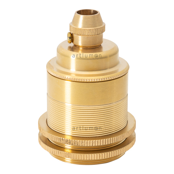 Portalámparas de gran calidad, metálico macizo, de aspecto retro industrial, en acabado oro brillo. Tiene dos arandelas metálicas para sujeción de pantallas o tulipas. Portalámparas decorativo vintage estilo “England”. Finaliza con un prensacables del mismo acabado que el portalámparas.