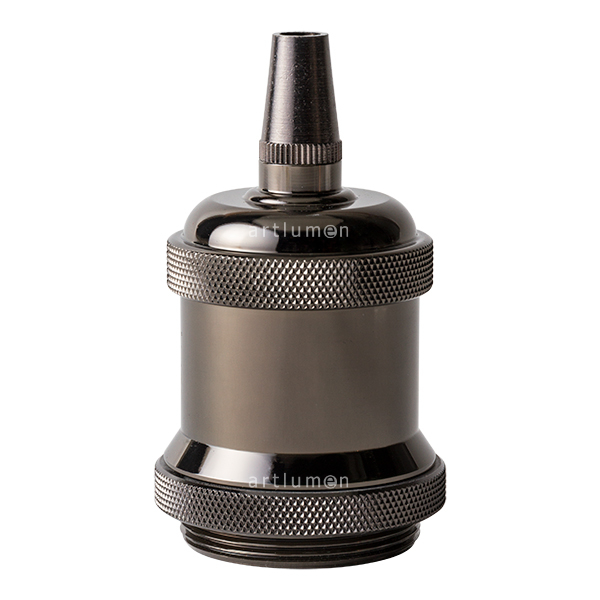 Elegante portalámparas metálico, en acabado negro grafito, de estilo vintage. Su interior es de porcelana, aportándole máxima resistencia. Ideal para destacar la belleza de las bombillas decorativas retro. También permite aplicar pantallas y tulipas sujetas con su anilla roscada. Incluye prensa cables del mismo acabado que el cuerpo del portalámparas.