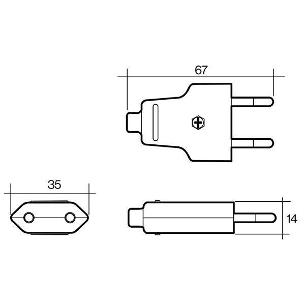 Clavija de enchufe bipolar (sin toma de tierra) de color blanca. Ideal para montaje de lámparas y aparatos eléctricos. Embornamiento del cable por tornillos. Goma flexible en la parte posterior para salida de cable. Color Blanco