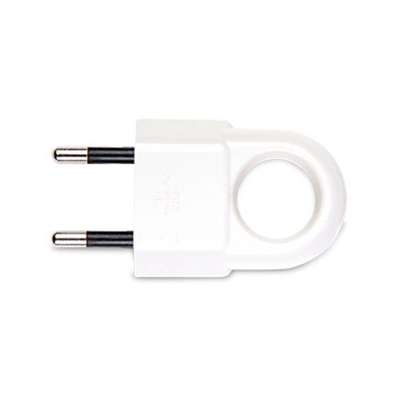 Clavija de enchufe bipolar (sin toma de tierra). Su cuerpo forma una anilla para poder tirar de ella y extraer de forma cómoda la clavija del enchufe.