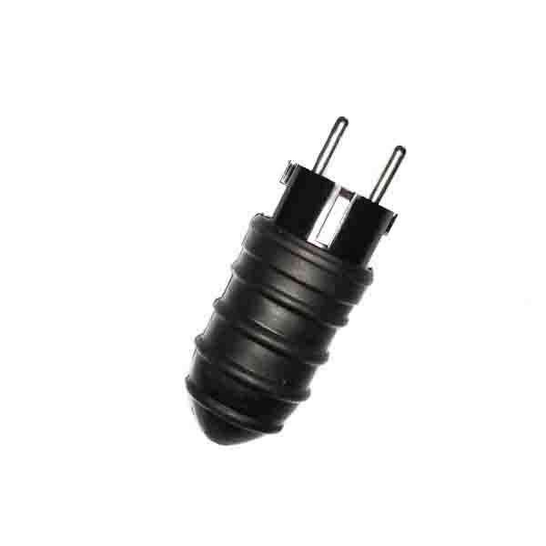 Clavija de enchufe reforzada, de goma negra, con toma de tierra lateral.