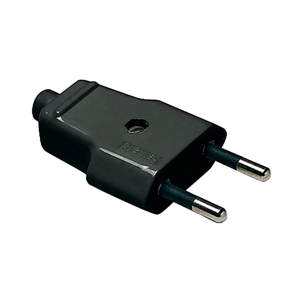 Clavija de enchufe bipolar (sin toma de tierra) de color negra. Ideal para montaje de lámparas y aparatos eléctricos. Embornamiento del cable por tornillos. Goma flexible en la parte posterior para salida de cable.