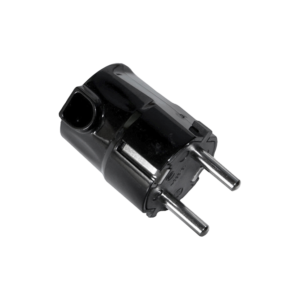Clavija de enchufe Schucko (espigas de 4,8mm) con Toma de Tierra. Carga máxima 16A. Con salida de cable lateral (ideal para enchufar detrás de muebles y que el cable no moleste).