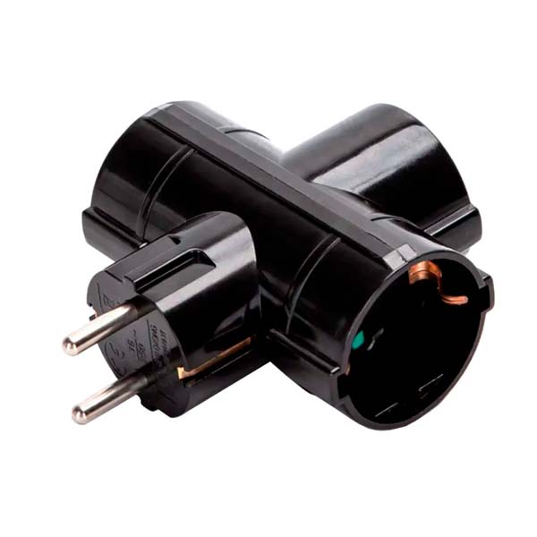 "Ladrón” con tres salidas. Adaptador triple para enchufar hasta tres aparatos (máximo 3500W). Clavija de espigas gruesas (d=4,8mm.)