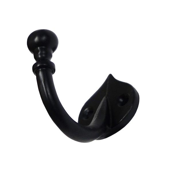 Percha fabricada en acero, color negro mate, acabado forja. Colgador individual con base en forma de punta de lanza.
