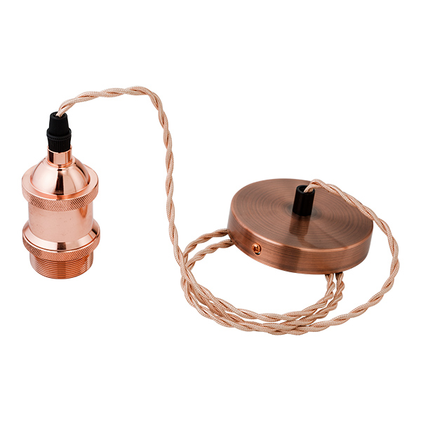 Lámpara colgante con portalámparas y florón de metal en acabado cobre. Cable textil trenzado de color cobre.