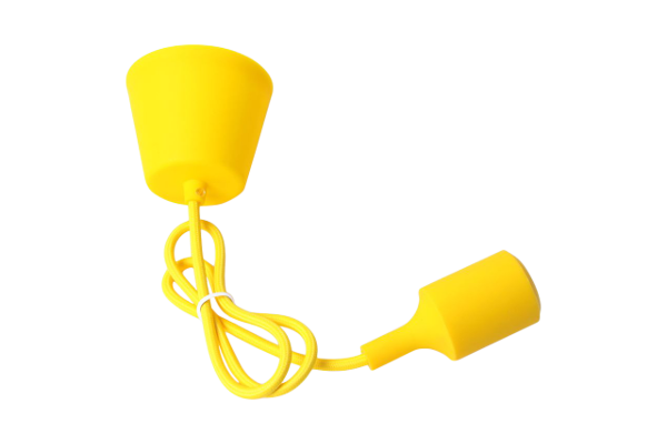 Lámpara colgante de cable con recubrimiento textil en color amarillo. Florón plástico, cable textil y portalámparas con funda de silicona, todo a juego, del mismo color.