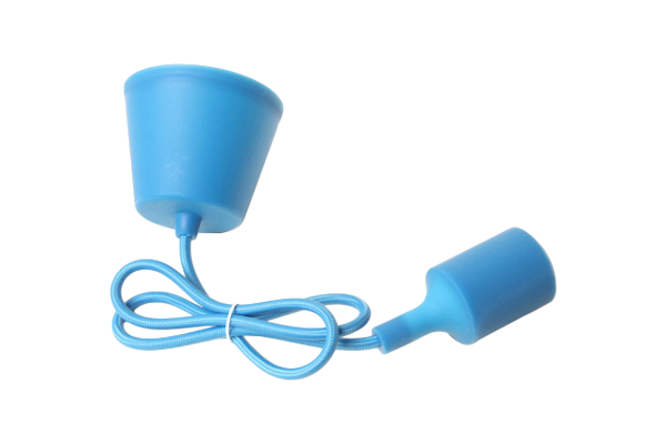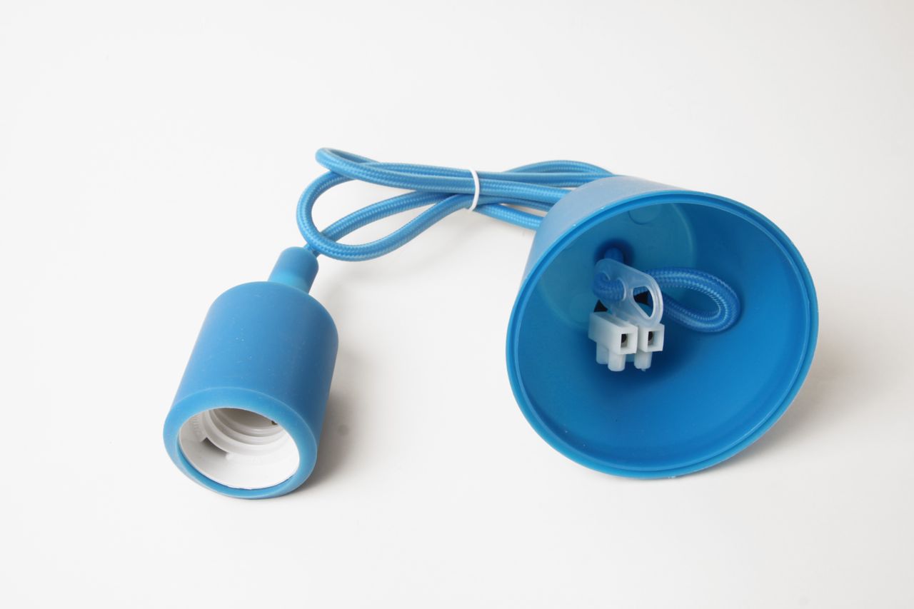 Se trata de una lámpara colgante de cable con recubrimiento textil en color azul. Florón plástico, cable textil y portalámparas con funda de silicona, todo a juego, del mismo color.
