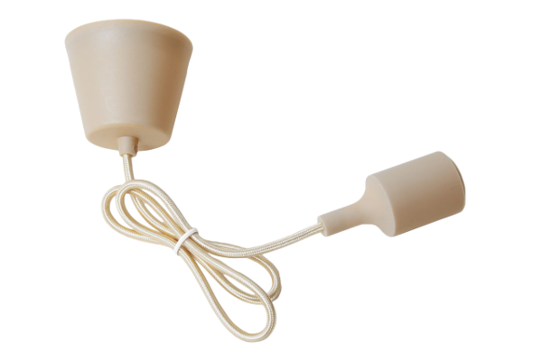 Se trata de una lámpara colgante de cable con recubrimiento textil en color dorado. Florón plástico, cable textil y portalámparas con funda de silicona, todo a juego, del mismo color.