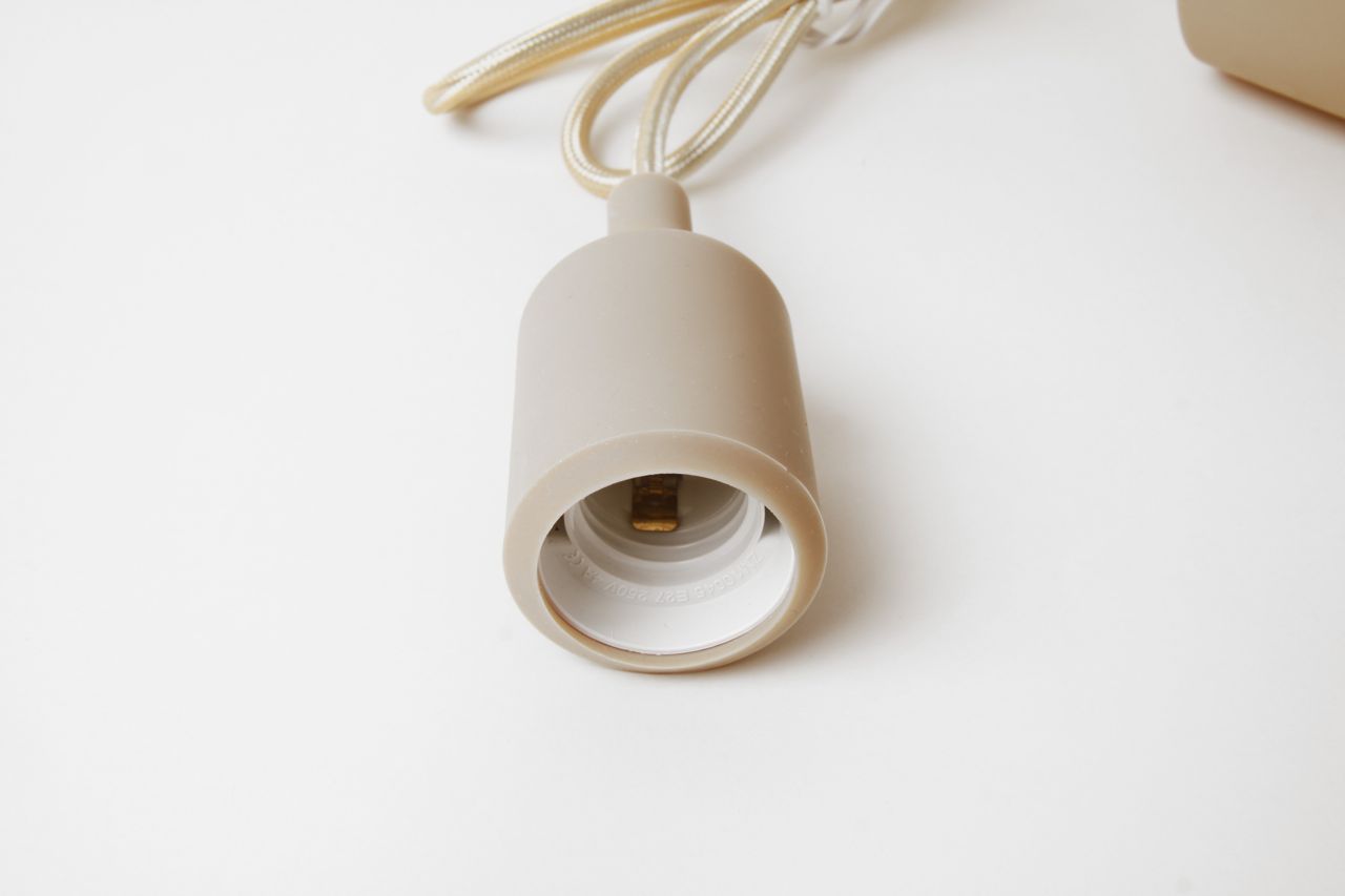 Se trata de una lámpara colgante de cable con recubrimiento textil en color dorado. Florón plástico, cable textil y portalámparas con funda de silicona, todo a juego, del mismo color.