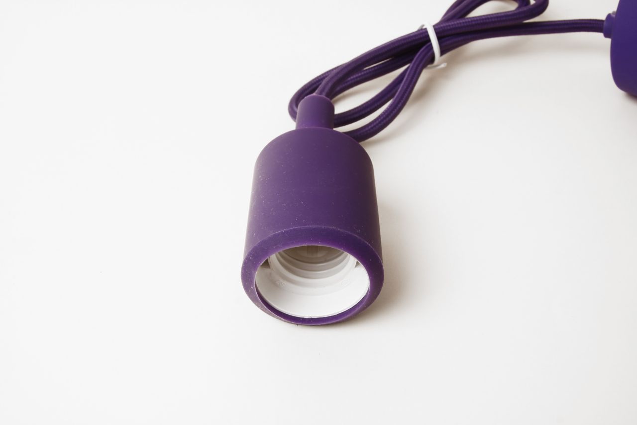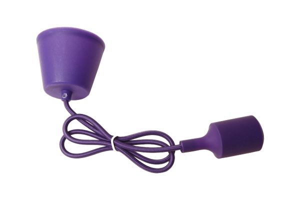 Lámpara colgante de cable con recubrimiento textil en color morado. Florón plástico, cable textil y portalámparas con funda de silicona, todo a juego, del mismo color.