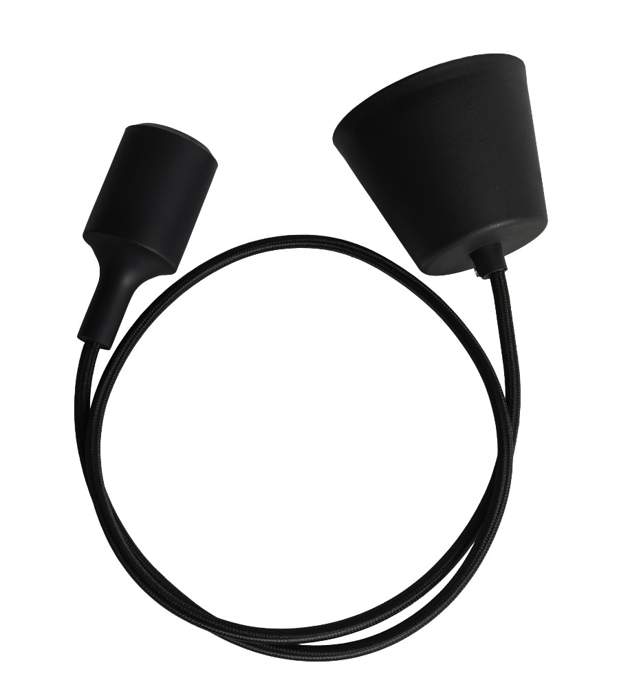 Lámpara colgante de cable con recubrimiento textil en color negro. Florón plástico, cable textil y portalámparas con funda de silicona, todo a juego, del mismo color.