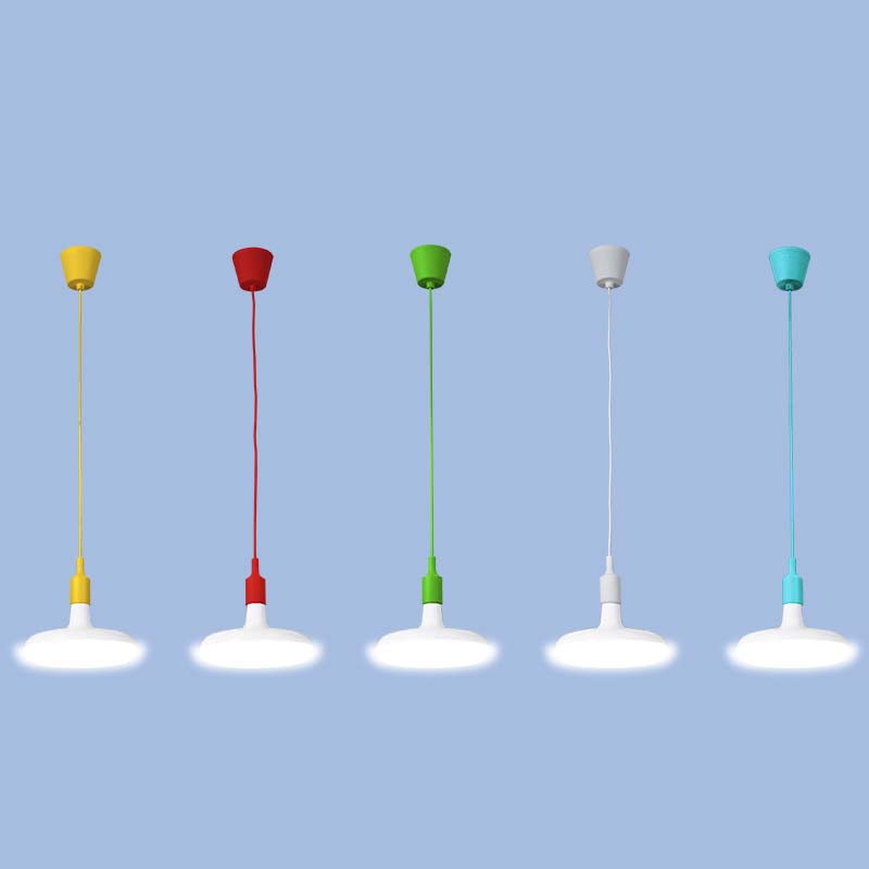 Lámpara colgante de cable con recubrimiento textil en color rojo. Florón plástico, cable textil y portalámparas con funda de silicona, todo a juego, del mismo color.